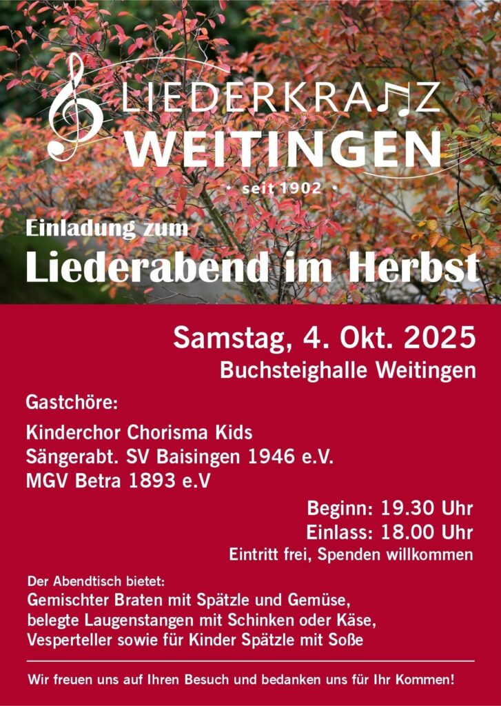 Der MGV Liederkranz Weitingen lädt herzlich zum festlichen Liederabend am Samstag, den 4. Oktober 2025, in die Buchsteighalle Weitingen ein.