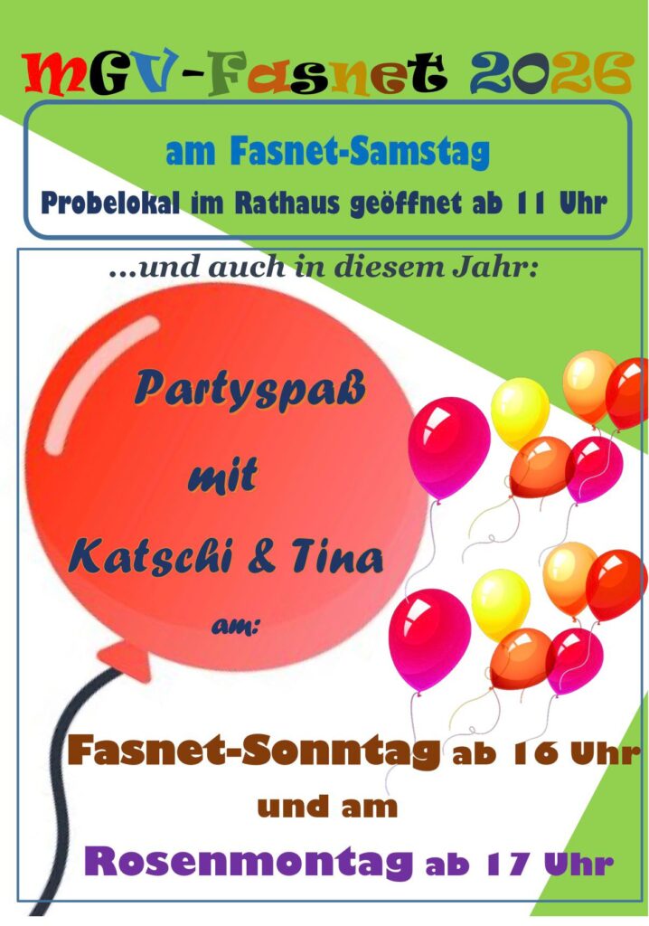An Sonntag und Montag sorgen Katschi und Martina nicht nur für die Bewirtung, sondern auch für gute Stimmung und ausgelassene Fasnet-Party. In närrischer und gemütlicher Atmosphäre bietet das Probelokal des MGV Betra damit an allen drei Tagen einen beliebten Treffpunkt während der Fasnet. Der Männergesangverein freut sich auf viele Besucher und fröhliche Stunden im Rathaus.